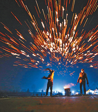 2月1日,河南武陟县嘉应观景区举行“打铁花”迎新春活动,民间艺人将生铁块烧到一定熔度后,用木板将铁块打上天空,形成“铁花火雨”景象,营造出浓浓的节日氛围。冯小敏摄(影像中国)