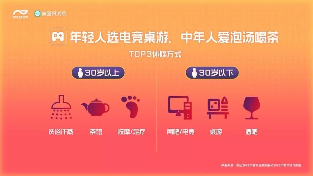 除了吃喝,春节该怎么玩?亲朋好友、同窗同事一起聚聚,休闲玩乐肯定少不了。在休闲方式上,近八成人选择泡汤养生。不同年龄人群也有自己的偏好。30岁以上偏爱洗浴汗蒸、茶馆、按摩/足疗,30岁以下偏爱网吧/电竞、桌游和酒吧。
