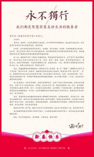 2月3日,张近东给坚守在一线岗位的苏宁员工及家人写了一封信,朴实的文字里充满情感,“是你们的默默坚守,成就了其他人的其乐融融;是你们的辛勤付出,方便了万千人的美好生活。谢谢你们为苏宁立下并实践‘春节不打烊’的标杆,谢谢你们时刻用实际行动证明‘服务是苏宁唯一的产品’”。