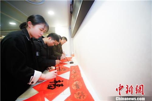各部门的“书法家”汇聚一堂写福字,写春联。远望3号船供图