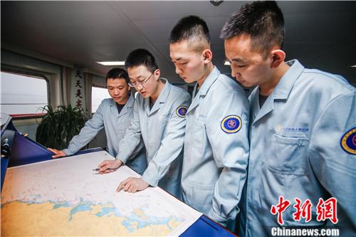 在船驾驶室,航海部门的工程师正在熟悉海图。远望3号船供图