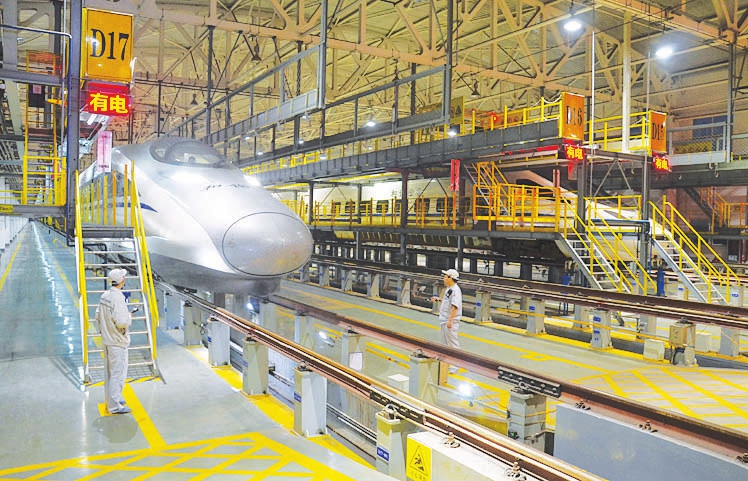 动车组运用所被人们称为“动车4S店”,4层楼高的检修库内,灯光亮如白昼,6条600米长的检修股道上,12辆动车组依次排列,多名身着制服的地勤机械师分别在列车的车顶、车底、转向架两侧紧张地忙碌着。