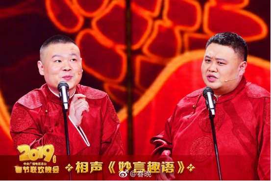 首个出场的语言类节目是岳云鹏和孙越合作的《妙言趣语》,两人将传统的猜字谜、作对联等春节年俗通过作品一一呈现,既展现了传统文化又抖了包袱。而岳云鹏和现场观众也互动热烈,有网友调侃,“看到春晚的观众也在‘平仄平仄平平仄,仄平仄平仄仄平’,还以为在看(德云社)专场呢!”