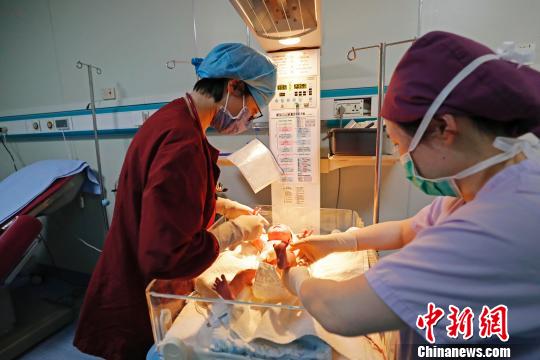 凌晨0:03分,上海市第一妇婴保健院的产房里迎来了第一只“金猪宝宝”,医护人员正在对宝宝进行检查。 殷立勤 摄