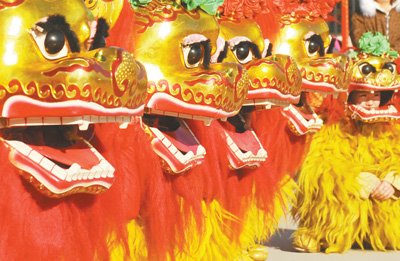上午10点,伴随着动感热烈的鼓点,几只红黄相间的狮子欢快登场。在观众的注视下,狮子们时而闪转腾挪,时而腾空跃起,时而顶腰扭动,下山探宝,把那股刚劲威猛劲儿表现得惟妙惟肖。
