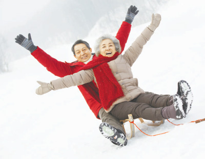 老年夫妻乘坐雪橇。