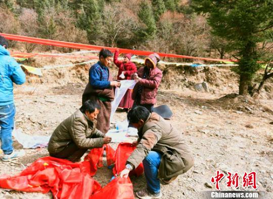 藏族同胞在事发地挂经幡祈福。 阿坝消防