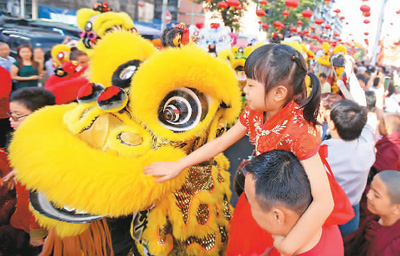 图为二月五日,在缅甸仰光唐人街街头,女孩抚摸舞狮表演队的狮头祈求好运。吴 昂摄(新华社发)