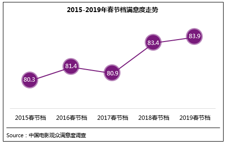 中国电影观众满意度调查·2019年春节档调查结果显示,春节档观众满意度得分83.9分,获“满意”评价,是自2015年开展调查以来春节档中的最高分,同时也是全部27个调查档期的第二名(第一名为2017年暑期档)。档期内不同类型的影片满足了观众多样化、差异化的观影需求,科幻片《流浪地球》以85.6分获档期满意度冠军,从1月11日上映坚持至春节档的动画电影《白蛇:缘起》以84.6分居第二位,《疯狂的外星人》(83.9分)、《飞驰人生》(83.7分)和《熊出没 原始时代》(83.5分)满意度进入档期TOP5。
