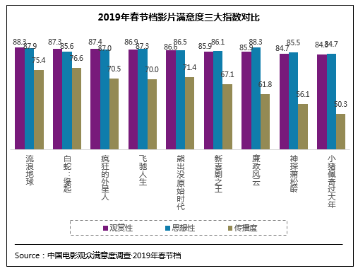 中国电影观众满意度调查 2019年春节档调查结果显示,春节档观众满意度得分83.9分,获“满意”评价,是自2015年开展调查以来春节档中的最高分,同时也是全部27个调查档期的第二名(第一名为2017年暑期档)。档期内不同类型的影片满足了观众多样化、差异化的观影需求,科幻片《流浪地球》以85.6分获档期满意度冠军,从1月11日上映坚持至春节档的动画电影《白蛇:缘起》以84.6分居第二位,《疯狂的外星人》(83.9分)、《飞驰人生》(83.7分)和《熊出没 原始时代》(83.5分)满意度进入档期TOP5。