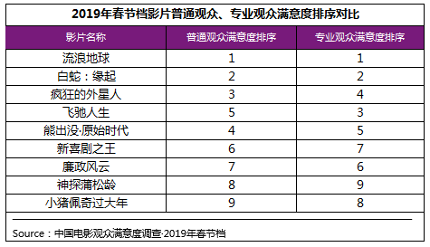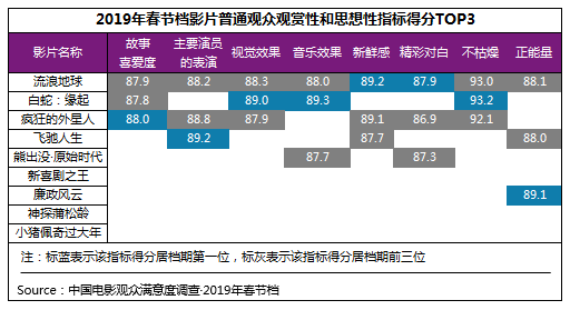 同样,普通观众和专业观众对单片满意度排序也基本一致。其中,从普通观众对观赏性、思想性各个细分维度的评价来看,2019年春节档影片“各显其能”,在不同维度的创作上表现出了优质的艺术水准。