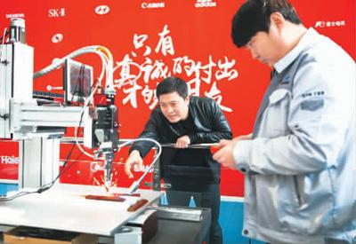 1月10日,在山东淄博,创业者颜景川(左)和同事调试激光焊接机。新华社记者 潘思危摄