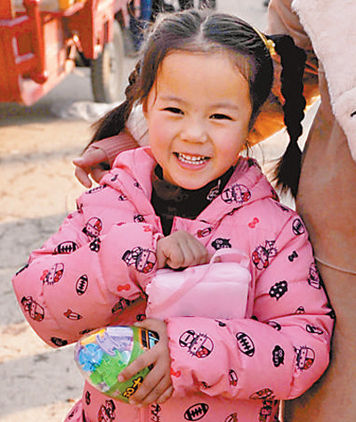 在山西永济市,小女孩在农村集市上买到了心爱的玩具。人民视觉
