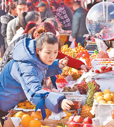 山东日照市岚山区中楼镇的农村消费者正在选购水果。人民视觉