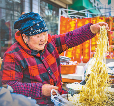 在甘肃平凉市泾川县窑店镇乡村集市上,一名村民正在出售手工面。人民视觉