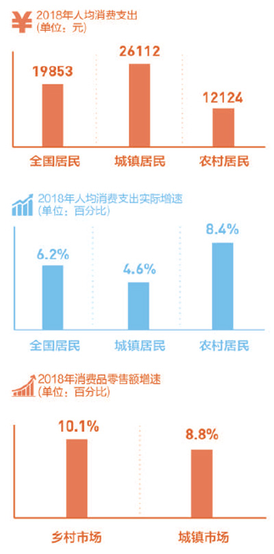 2018年,我国城乡市场结构继续优化,农村居民消费增速快于城镇,农村消费市场潜力大、空间大。
