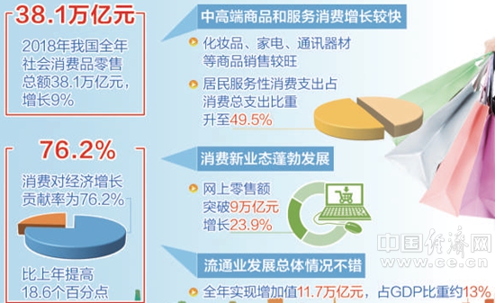 2月12日,在商务部召开的专题新闻发布会上,商务部副部长钱克明表示,2018年我国全年社会消费品零售总额38.1万亿元,增长9%,保持平稳较快发展势头。消费连续5年成为经济增长第一动力,对经济增长贡献率为76.2%,比上年提高18.6个百分点。