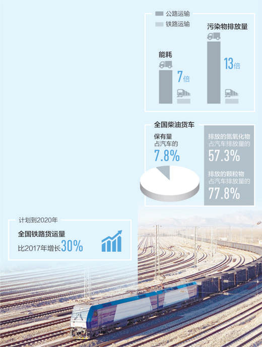 2017年,柴油货车保有量仅占全国汽车保有量的7.8%,但是氮氧化物的排放占了全部汽车排放量的57.3%,颗粒物的排放更是占到了77.8%。而铁路主干线路实现电力机车牵引,只有极少数支线和车站调车使用内燃机车。