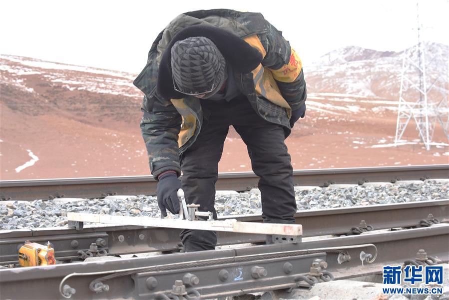 青藏铁路唐古拉线路工人用道尺检测轨道(1月28日摄)。新华社记者 周健伟 摄
