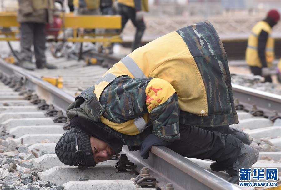 扎西旺堆跪在铁轨上观察铁轨水平高度(1月28日摄)。新华社记者 周健伟 摄