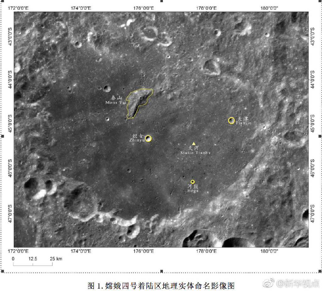 国家航天局、中国科学院和国际天文学联合会15日联合召开新闻发布会,向全世界发布嫦娥四号着陆区域月球地理实体命名:嫦娥四号着陆点命名为天河基地;着陆点周围呈三角形排列的三个环形坑,分别命名为织女、河鼓和天津;着陆点所在冯·卡门坑内的中央峰命名为泰山。这是我国月球探测工程科学数据成果在月球地理实体命名上的又一次重要应用。(记者胡喆)