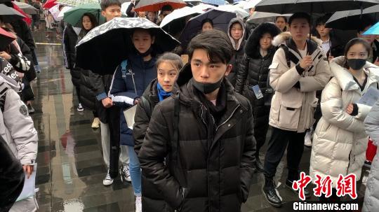 当天一早,上海就下着雨,天气也十分寒冷,但考生们在校门口打着伞,有序排队进入校园。