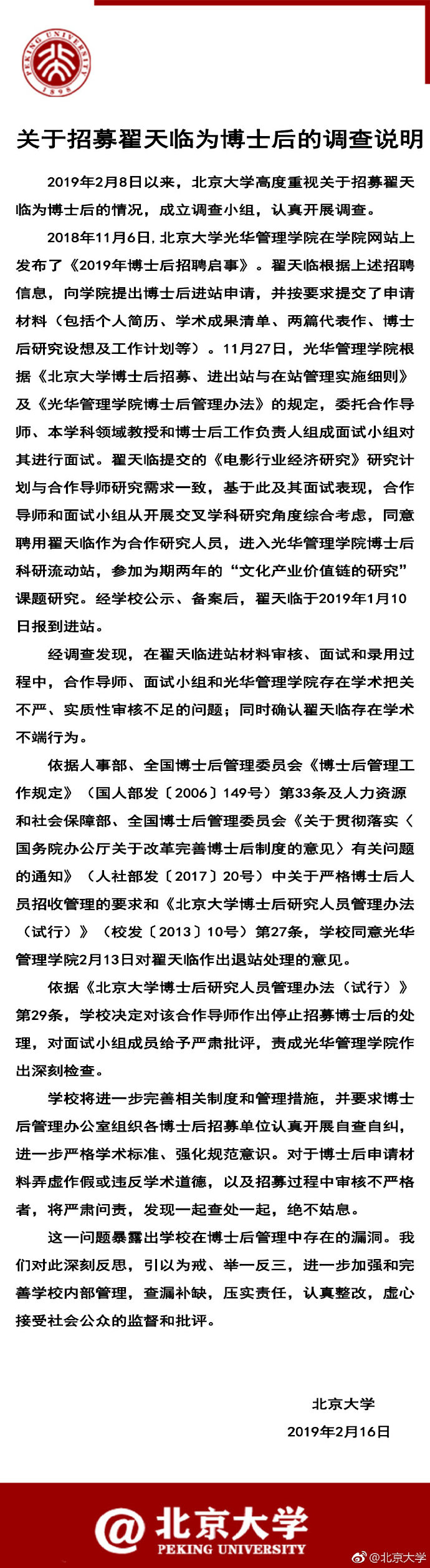 中新网2月16日电 北京大学16日在其官方微博公布《关于招募翟天临为博士后的调查说明》,北京大学确认翟天临存在学术不端行为;同意北京大学光华管理学院对翟天临作出的退出博士后工作站的决定。