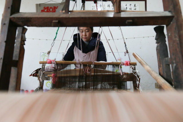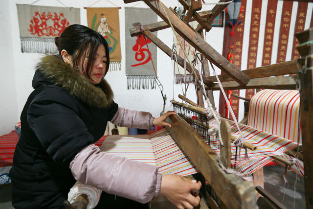 在山东省济宁市嘉祥县一家鲁锦纺织企业,工人在织布。