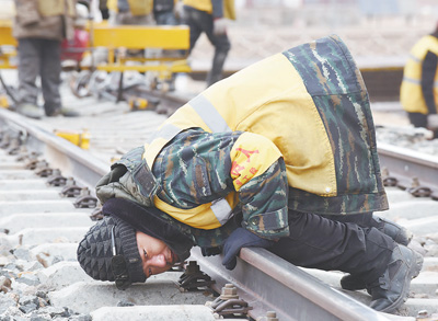 跪在铁轨上观察铁轨水平高度。