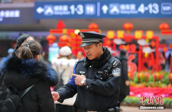北京西客站值班警长贾宝刚在站内巡逻。中新社记者 杨可佳摄