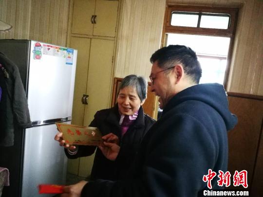 76岁的鲍颖(左)自居委会主任任万荣手中接过光荣牌。 许婧 摄