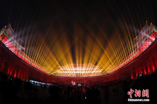 元宵之夜的故宫,午门城楼及东、西雁翅楼在灯光映照下,展现壮美雄姿。太和门建筑主体及汉白玉台阶作为主要投影目标,则用55000流明的激光电影放映机,通过激光投影技术,实现精准对位,让数字画面跃然于故宫古建筑之上。