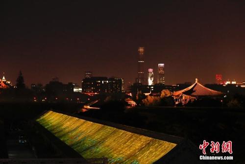 此外,午门至神武门东侧城墙区域,由充满节日氛围的红灯笼点缀城墙,引导观众步行。临近城墙西侧的建筑也被点亮,营造出喜庆祥和的节庆氛围。《千里江山图卷》等绘画作品以艺术灯光形式,投影于建筑屋顶上。