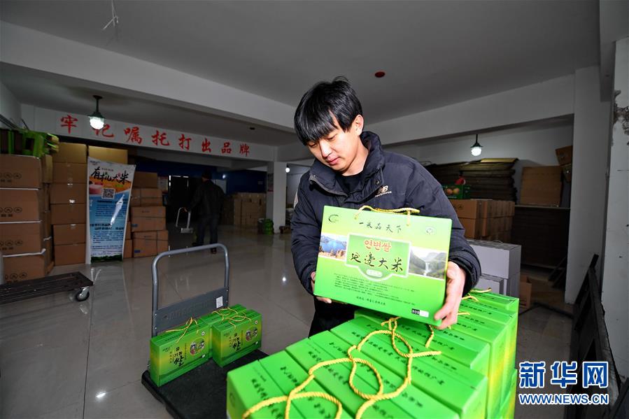 吉林省和龙市光东村,农户在搬运打包装箱后的“延边大米”(2019年2月4日摄)。 新华社记者 张楠 摄
