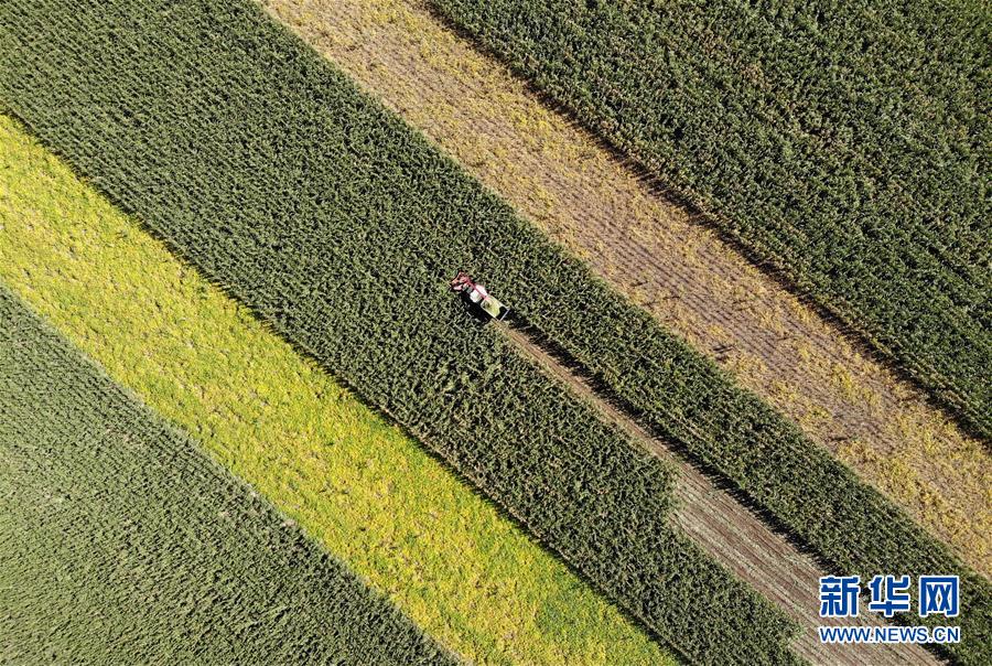 在吉林省长春市双阳区鹿乡镇,农户使用机械收割青贮玉米(2018年9月18日摄)。新华社记者 林宏 摄