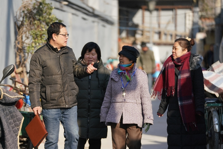 2017年12月13日,刘跃明(左一)与街巷居民蔡阿姨(右二)和社区工作人员一起在街巷内巡视了解情况。刘跃明是北京市东城区人民市场东巷街巷长,责任街巷总长204米。新华社记者 鞠焕宗 摄