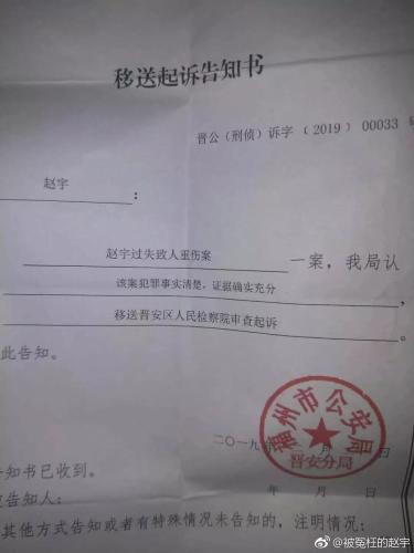 赵宇出示移送起诉告知书。图片来源:认证为“新闻当事人 赵宇”的微博