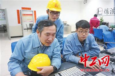新招聘的高职生跟着中国石化技能大师孙同根学习操作技巧。陈康 摄