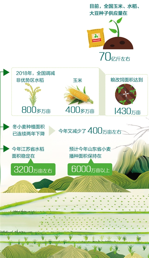 春播是全年农业生产的大头、占全年农作物播种面积近50%,也是安排作物茬口、调整种植结构的重要节点。2018年,全国调减非优势区水稻800多万亩、玉米400多万亩,粮改饲面积达到1430万亩。韩长赋说,今年种植结构调整的重点是巩固玉米调整成果,适当调减低质低效区水稻和小麦面积,扩大大豆和油料生产。