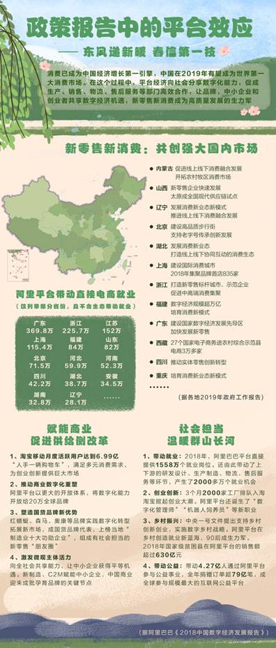 公开数据显示,阿里巴巴不仅是全球品牌财报里的明星,也是繁荣各地消费市场的主力军,发展数字经济、以新零售拉动新消费等被写进一年最重要的区域发展规划——政府工作报告中,成为促进区域经济发展的新动能。