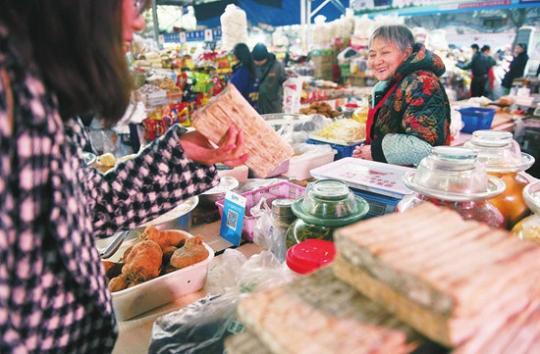 四川宜宾一家菜市场里卖豆腐的老阿姨笑得很灿烂,顾客手里拿着的是一张臭味千张。