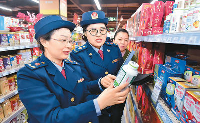 1月8日,河北省石家庄新乐市一家超市内,市场监督管理局执法人员正在对销售的保健品进行检查。贾敏杰摄(人民视觉)
