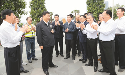 二〇一八年十月二十二日至二十五日,中共中央总书记、国家主席、中央军委主席习近平在广东考察。图为十月二十四日上午,习近平在广东自由贸易试验区深圳前海蛇口片区考察。在前海石前,习近平同前海建设者和见证者代表同话沧桑巨变。