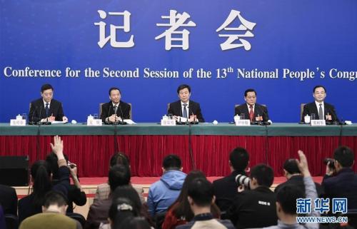 3月10日,十三届全国人大二次会议新闻中心举行记者会,邀请全国人大监察和司法委员会副主任委员徐显明、全国人大财政经济委员会副主任委员尹中卿、全国人大教育科学文化卫生委员会副主任委员吴恒、全国人大环境与资源保护委员会副主任委员窦树华和全国人大常委会预算工作委员会副主任朱明春就“人大监督工作”相关问题回答中外记者提问。 新华社记者 王鹏 摄