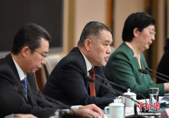 3月11日,十三届全国人大二次会议新闻中心举行记者会,邀请国家市场监督管理总局局长张茅、国家药品监督管理局局长焦红(右)、国家知识产权局局长申长雨(左)就“加强市场监管 维护市场秩序”相关问题回答中外记者提问。图为张茅(中)回答记者提问。中新社记者 侯宇 摄