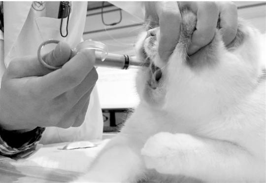 医生正在给猫咪喂体内驱虫药。本报记者 应陶