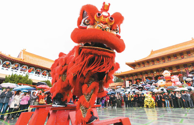中国在世界的影响力越来越大,给海外华侨华人增添了空前的自信。近年来,每逢中国农历新年,精彩纷呈的庆祝活动就会在许多国家展开,各国民众和华侨华人共同体验中国春节文化、共享节日快乐。图为二月五日,在美国加利福尼亚州洛杉矶附近的西来寺,人们观看舞狮表演。钱卫忠摄(新华社发)