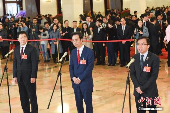 3月13日,全国政协十三届二次会议在北京人民大会堂举行闭幕会。图为全国政协委员陈卓禧(右)、梁华(中)、骆沙鸣(左)在“委员通道”接受采访。中新社记者 张娅子 摄