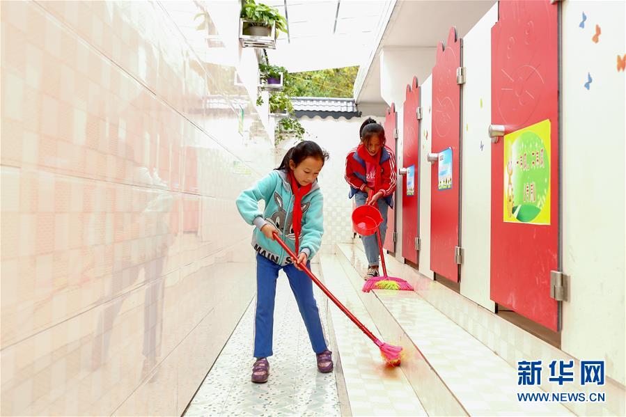 两名学生在贵州省织金县熊家场镇小学的厕所打扫卫生(2018年10月23日摄)。新华社记者 张玉薇 摄