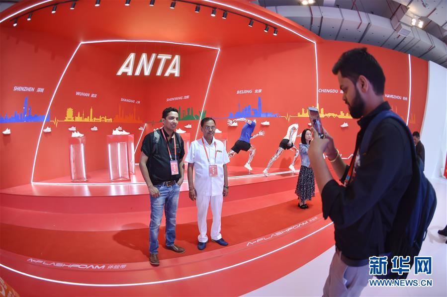 在一年一度的中国(晋江)国际鞋业暨国际体育产业博览会上,来自印度的客商在安踏展位前留影(2018年4月19日摄)。新华社记者 宋为伟 摄